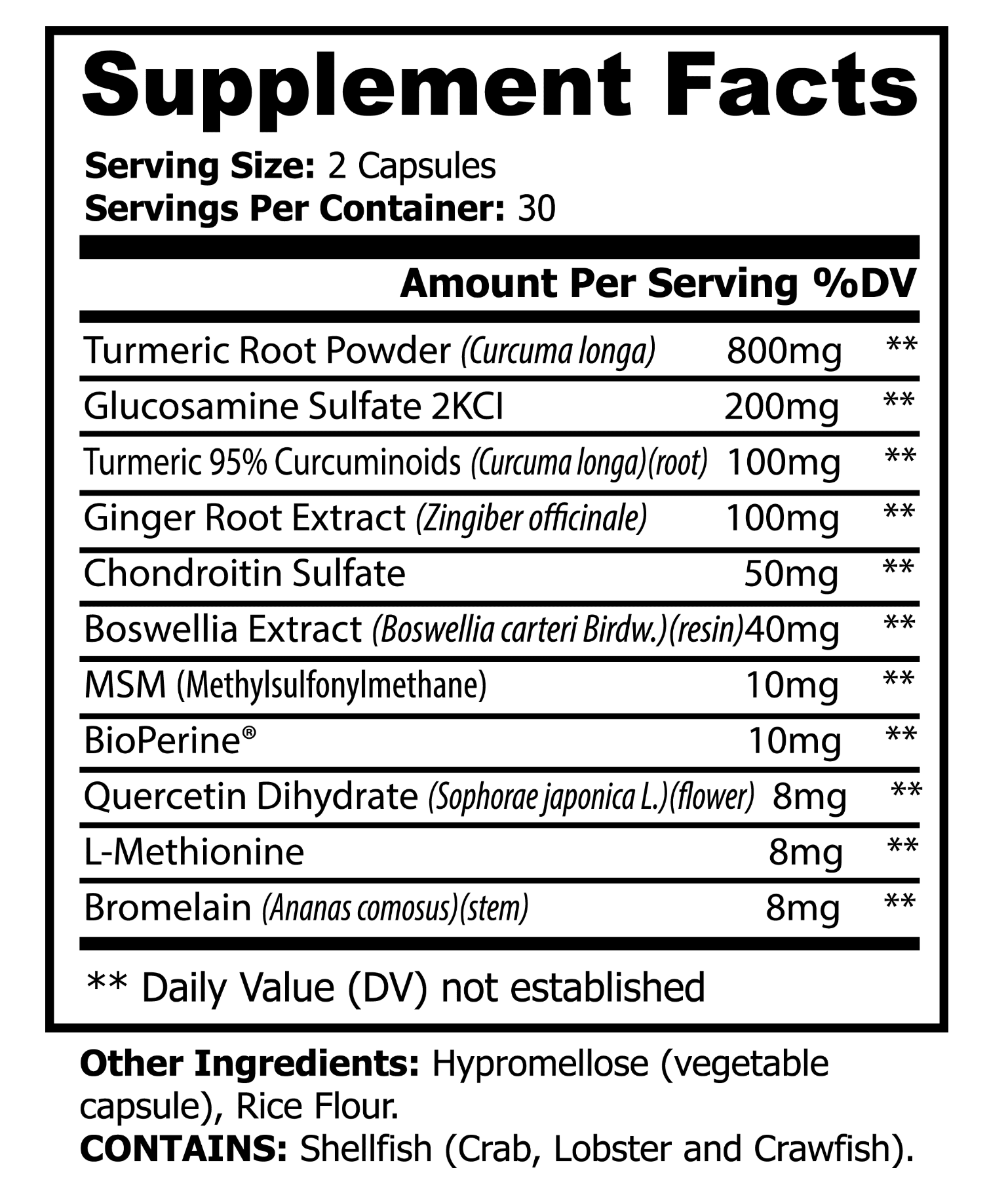 Ingredients: Turmeric Root Powder, Glucosamine Sulfate 2KCI, Turmeric 95% Curcuminoids, Ginger Root Extract, Chondroitin Sulfate, Boswellia Extract, MSM, BioPerine®, Quercetin Dihydrate, L-Methionine, Bromelain, Hypromellose (vegetable capsule), Rice Flour.